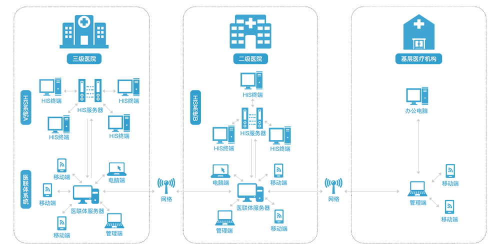 统一信息平台:它与各医院HIS系统平行构建,可包容并整合不同HIS系统下的医院数据,建立统一的医疗服务数据格式,实现健康档案、电子病历的连续记录和医联体内诊疗信息的共享互通; 充分发挥出信息系统对医联体的支撑作用。